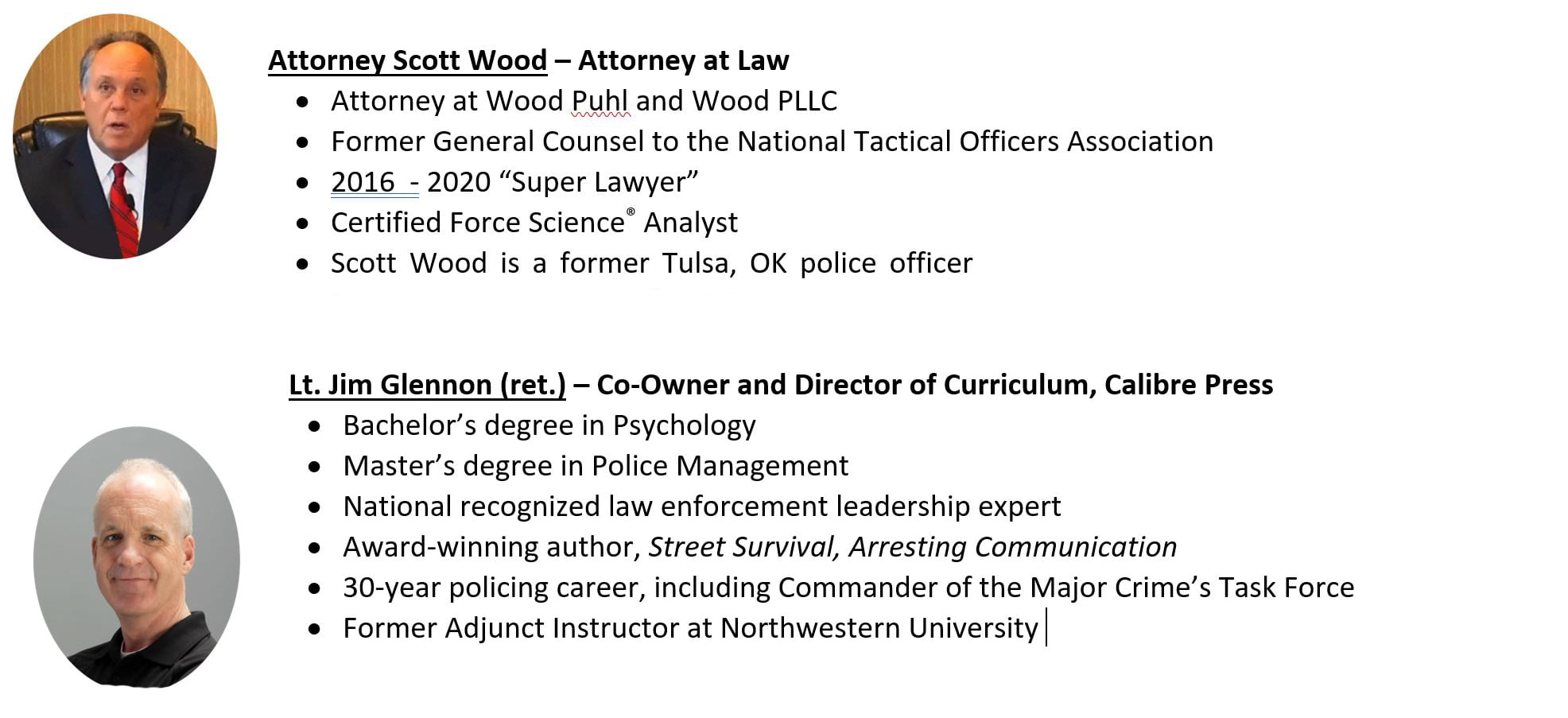 This program is led by Calibre’s Lt. Jim Glennon and Attorney Scott Wood, both experts in the field of law enforcement and the legality of intervention. Jim and Scott will provide practical and powerful ‘best practices’ from policy considerations to training curriculum in an effort to produce a culture that supports and practices intervention at the critical moment it becomes necessary.